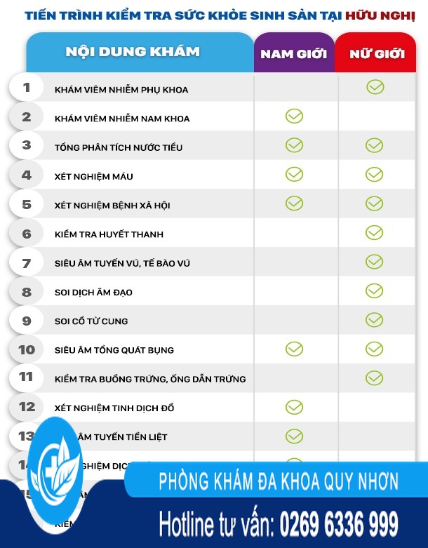 Kiểm tra để phát hiện bệnh lý liên quan đến khả năng sinh sản: Bệnh xã hội, viêm phụ khoa, sức khỏe tinh trùng.