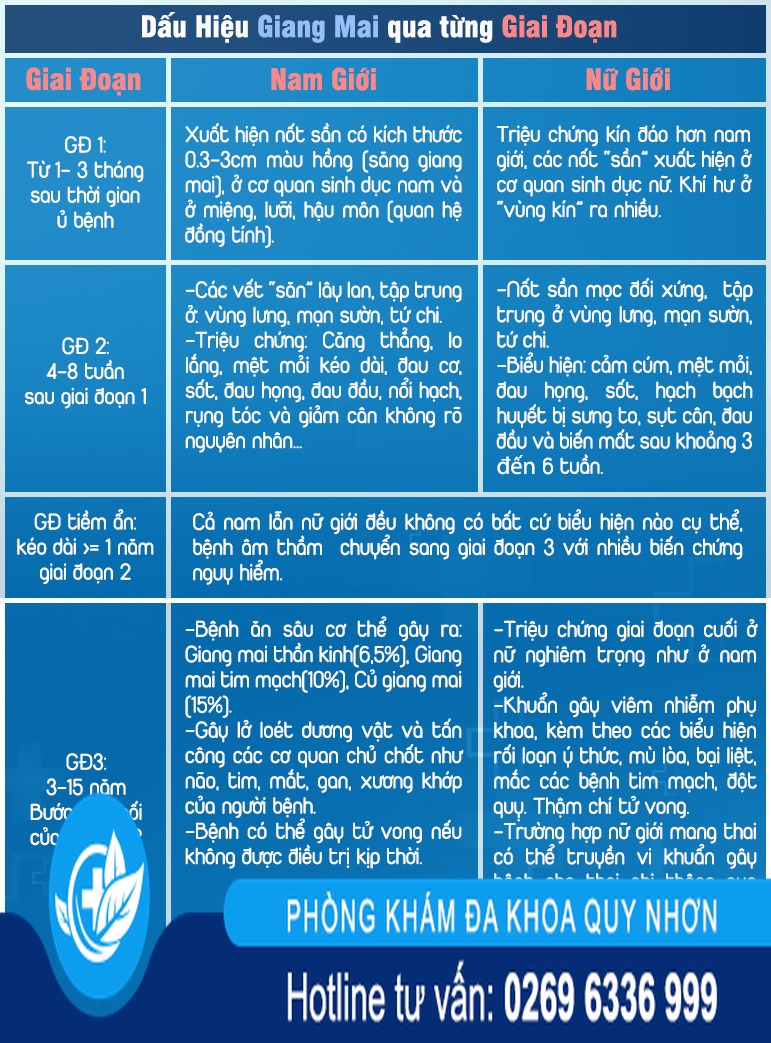 Do đó, bệnh rất dễ nhầm lẫn với triệu chứng của các bệnh khác, và vô tình lây truyền sang cho người khác mà không biết. Các chuyên gia bệnh xã hội chia giang mai thành 4 giai đoạn và ở mỗi giai đoạn sẽ có những dấu hiệu đặc trưng ở nam và nữ khác nhau như sau: